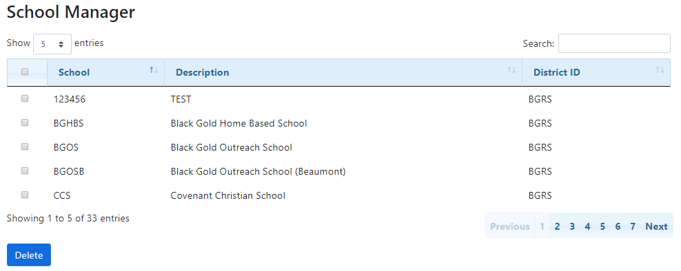 The School Manager tool is used to add, delete, and update the schools in BusPlanner Web. The schools maintained in the School Manager section allow you, as a Site Administration user, to give other users access to their information in BusPlanner Web. You may click on the School ID, School, Description, or District ID to sort the list of schools.